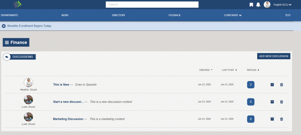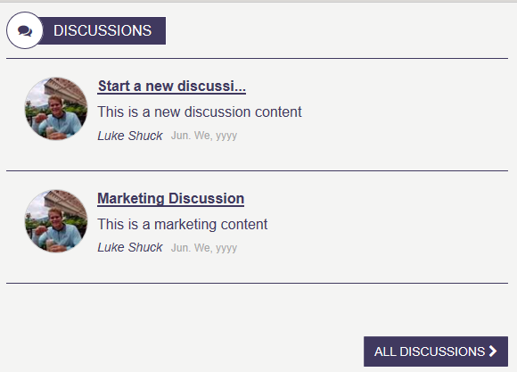 The Discussion Board displays the five most recently added discussion threads that have been added to the current site Discussions_AK list. Click on the title of a thread and the user will navigate to the selected discussions thread page, where the full thread is displayed and where a user can reply to the thread. Click on “All Discussions’ and the user will navigate to the Discussion listing page where all active discussion threads will be displayed.