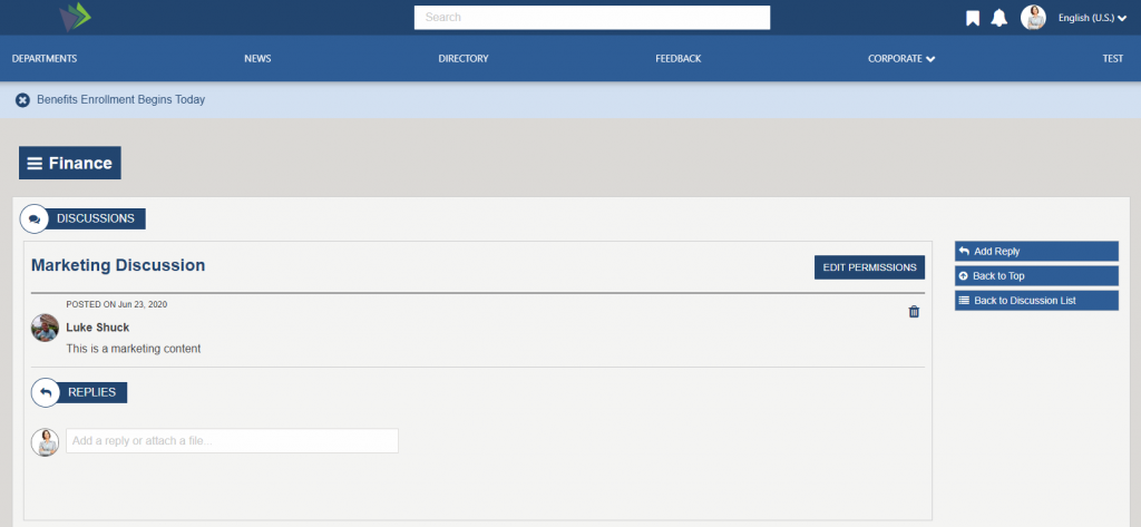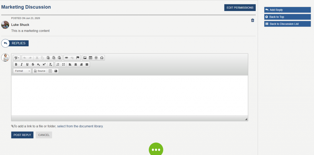 Discussion Thread is an item in the Discussion_AK list. Here users may add replies, edit permissions, delete replies or delete the thread. When a user clicks into the “Add a reply or attach a file”, the WYSIWYG editor will appear, allowing user to add a reply. Click on “select from the document library”, a modal will appear, allowing the user to attach a file link to this discussion thread. Click on “EDIT PERMISSIONS”, a modal will appear, allow the user to update and specify one or more SharePoint security group who have access and able to view this discussion thread. This widget is not associated with any AppManager app.