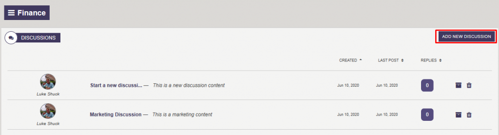 The Discussion Board Listing displays the discussions that are in the Discussions_AK list. Clicking on the Discussion link will bring you to the DiscussThread page. Clicking Add New Discussion will take you to DiscussNew page and allow you to create a new Discussion. Discussions can be sorted by creation date, last post and number of replies. Users with ownership of discussion can archive or delete their discussion. This widget is not associated with any AppManager app.