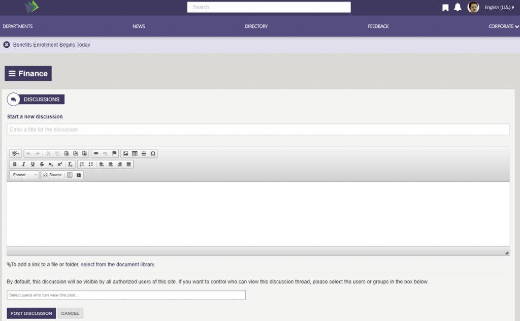 Allows the user to add a new discussion thread, a new item will be added to Discussions_AK. The user enters the Thread title in the “Enter a title for the discussion”, input field. The WYSIWYG editor allow the user to add the detail of the discussions. Click on “select from the document library”, a modal will appear, allowing the user to attach a file link to this discussion thread. By default, all users who have access to the site have access to this discussion. Click on “Select users who can view this post” will allow the user to specify one or more SharePoint security group who have access and able to view this discussion thread. This widget is not associated with any AppManager app.